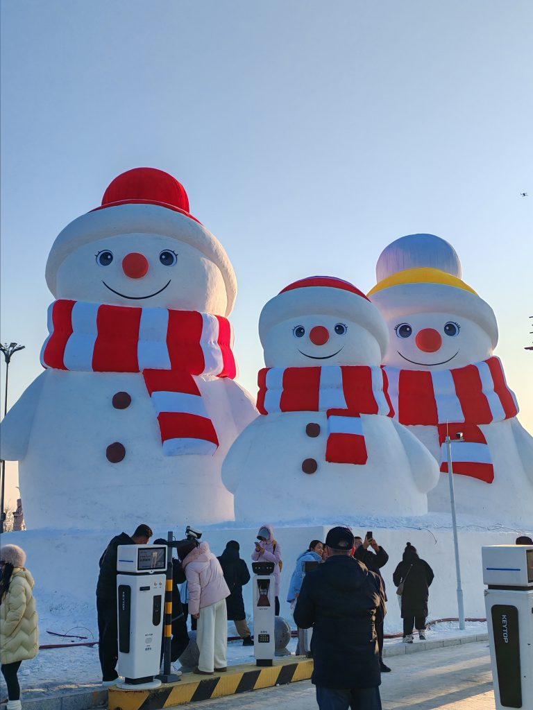 在哈尔滨冰雪大世界东检票门口,看到了“童话雪人一家”完成了雕刻,同时戴上了帽子和围巾,一家三口喜气洋洋、温暖可人。“童话雪人一家”雪雕高15米,是今年哈尔滨冰雪大世界的“迎宾先行者”,雪人爸爸的沉稳、雪人妈妈的温柔与雪人宝宝的俏皮被刻画得栩栩如生。